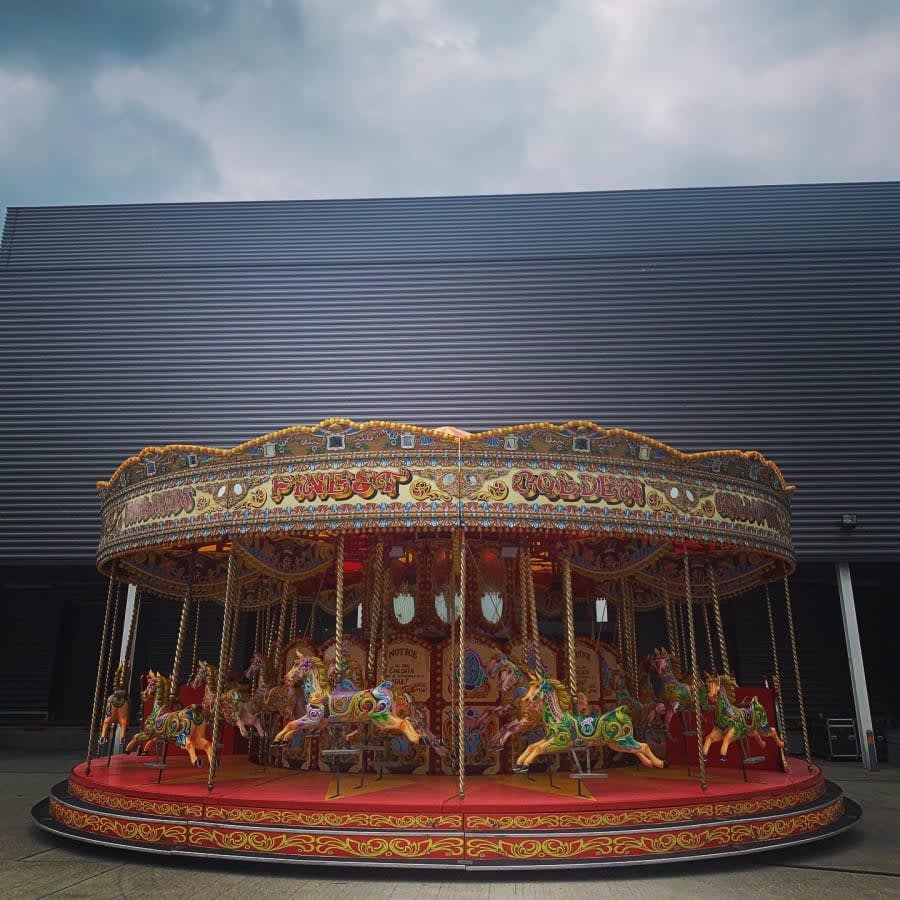 Our golden Merry-go-Round carousel is better suited for outdoor events, as it offers less flexibility for deliveries than our green carousel. This traditional fairground carousel also dates back to the early 1900s, and has a beautiful and elegant theme that harkens back to the fairgrounds and funfairs of years gone by.